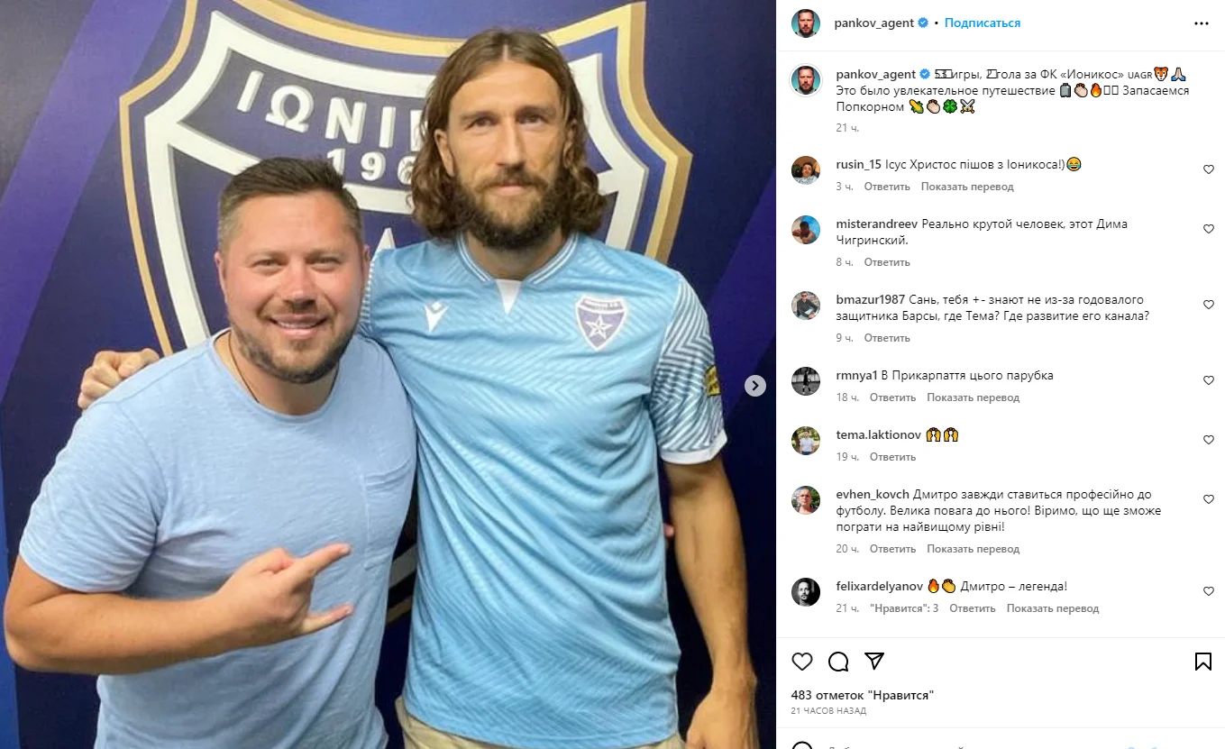Александр Панков, представляющий интересы Дмитрия Чигринского, намекнул, что его подопечный покинет Ионикос, но вешать бутсы на гвоздь пока не собирается.