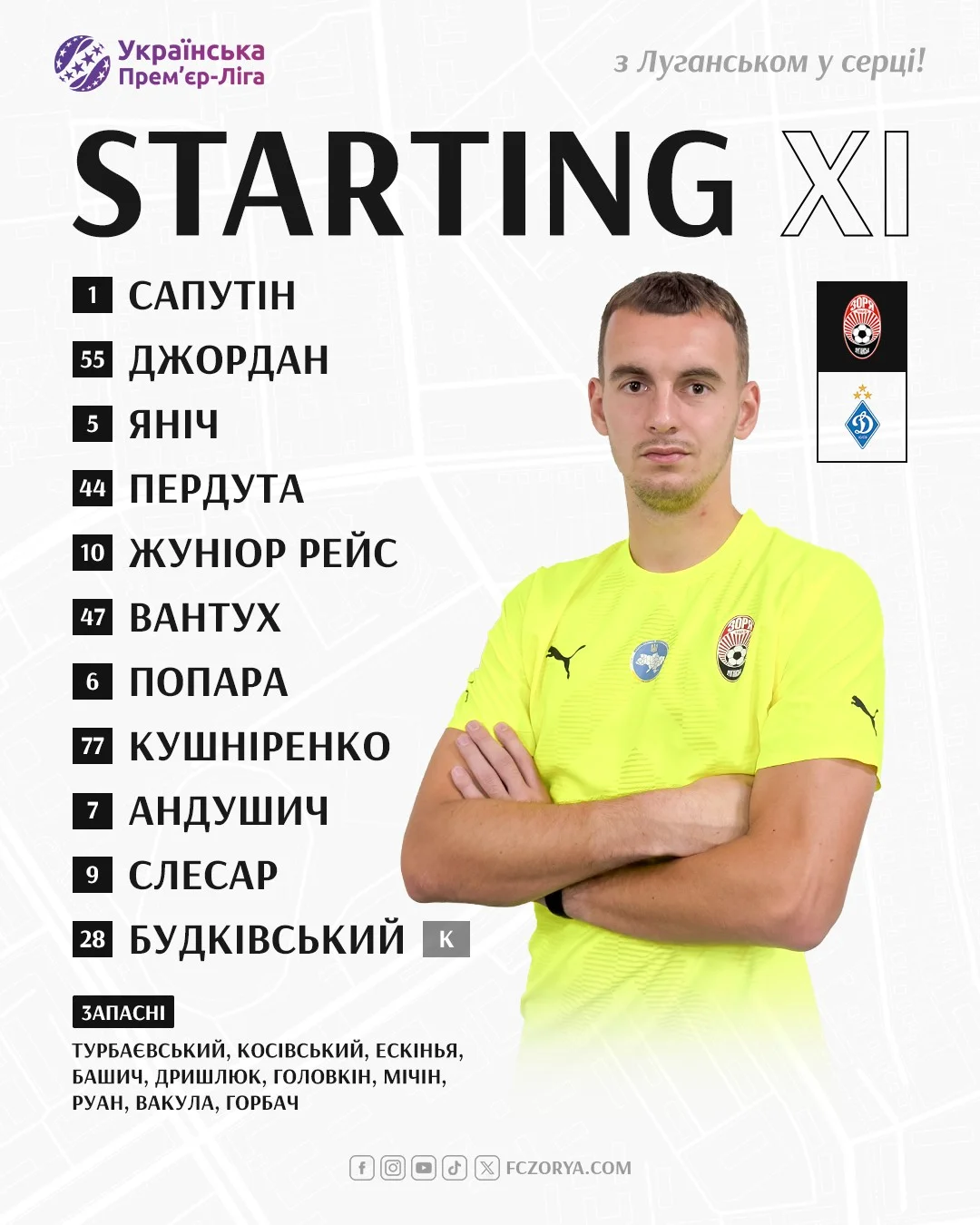 Стартовый состав Зари: Сапутин – Пердута, Джордан, Янич, Жуниньо – Попара – Слесар, Анджушич, Кушниренко, Вантух – Будковский (к).