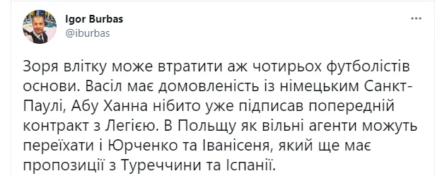 "Заря летом может потерять сразу четырех футболистов основы. Никола Василь имеет договоренность с немецким Санкт-Паули, а Джоэль Абу Ханна якобы уже подписал предварительный контракт с Легией.
