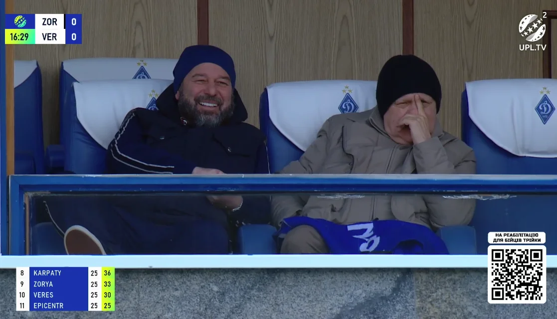 Первая 20-минутка матча оказалась катастрофически скучной. Хорошее настроение сохранял только президент Зари – Евгений Геллер. А вот Игорь Суркис от такого зрелища хватался за голову.