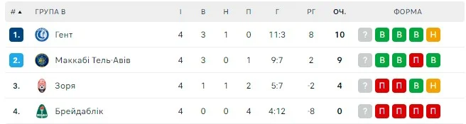 После четырех туров у Гента – 10 очков, Маккаби набирает 9. Заря остается с 4-мя. Шансы на евровесну – чисто математические.