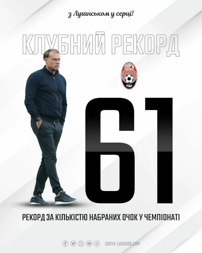 Победа над Ингульцом (2:0) в рамках 27-го тура позволила луганцам переписать свою историю. Заря установила новый рекорд клуба по количеству набранных очков в течение одного сезона – 61 зачетный пункт. У команды будет еще три матча, чтобы поднять планку еще выше.