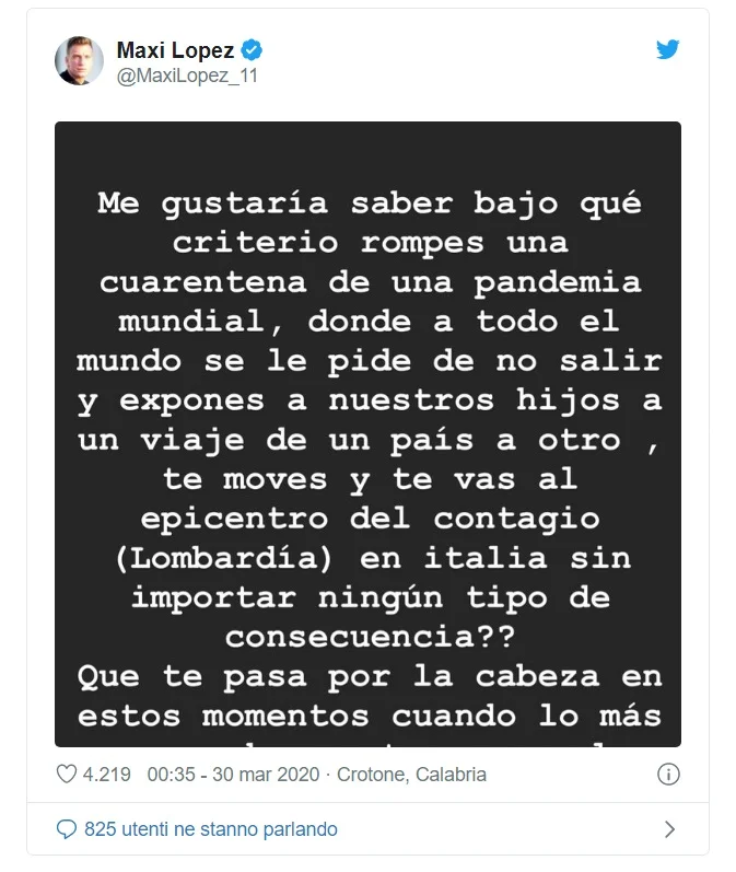 Икарди и Ванда решили покинуть Париж и дождаться возобновления сезона в Милане, где у пары есть собственный дом. Этот поступок не понравился бывшему мужу девушки Макси Лопесу, ведь в рискованную поездку отправились также трое его детей. Форвард Кротоне бурно отреагировал на этот поступок.