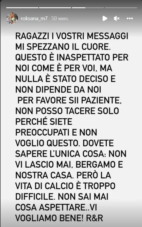 В другой сторис она написала: "Для нас это так же неожиданно, как и для вас. Ничего не решено и от нас это не зависит. Бергамо — наш дом, но футбол тяжелый, и никогда не знаешь, чего ожидать", а также лайкнула вопрос о переезде в Англию. На днях появилась информация, что Малиновский может продолжить свою карьеру в Ноттингем Форест, который якобы предложил 15 млн евро за украинца.