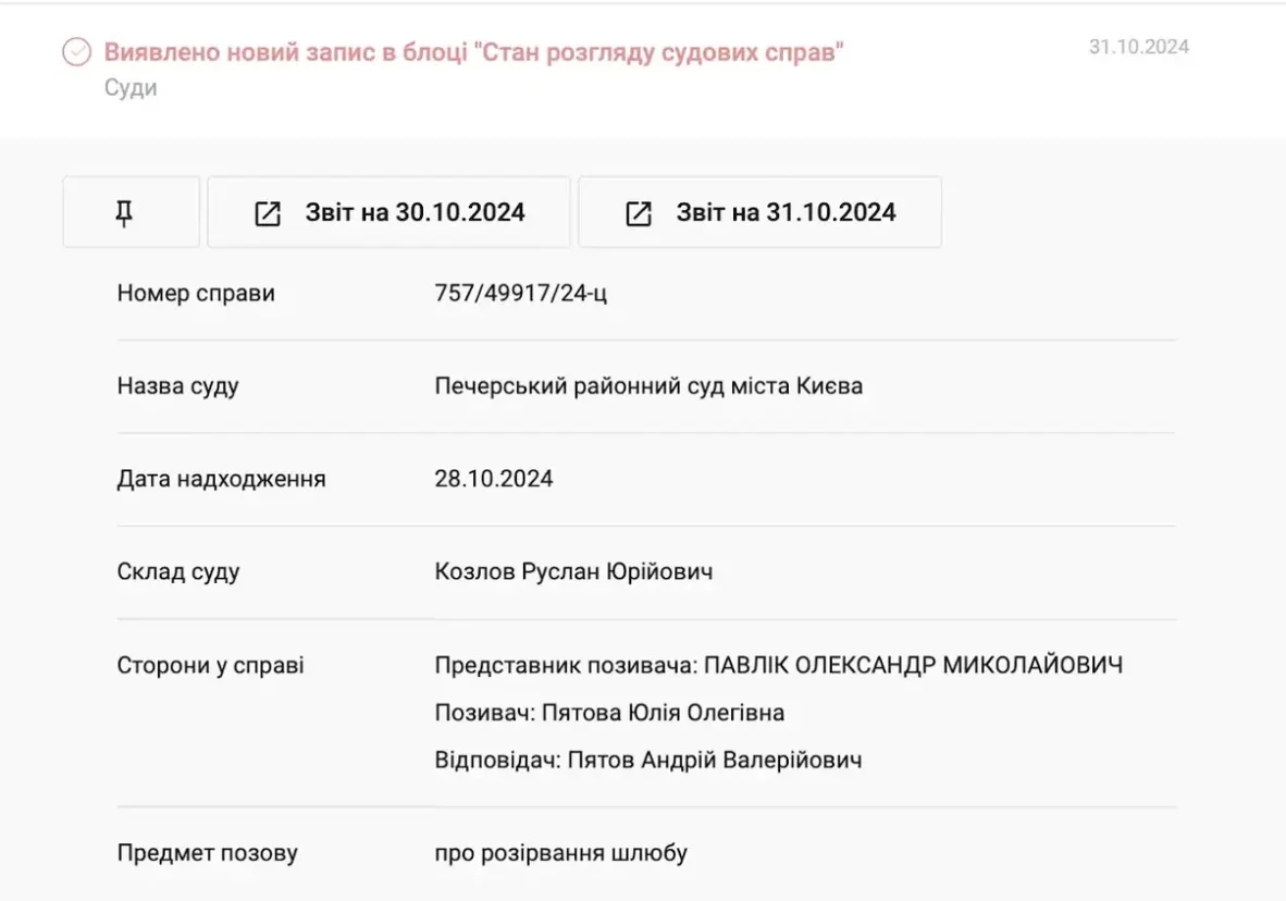 Жена легенды "горняков" подала на развод. Соответствующее дело рассматривается в Печерском районном суде города Киева.