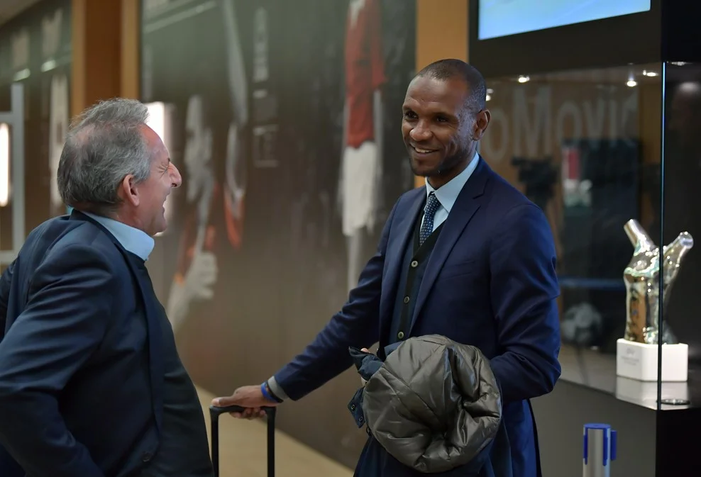 Технический секретарь Барселоны Эрик Абидаль беседует с бывшим спортдиром каталонцев Чики Бегиристайном, который сейчас представляет интересы Манчестер Сити.