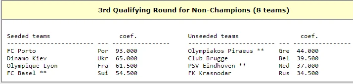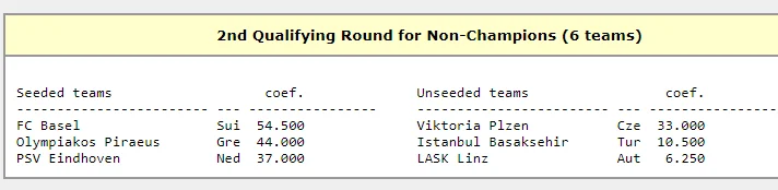 Во втором квалифай-раунде будут определяться потенциальные соперники киевлян. Сеяными здесь являются Базель, Олимпиакос и ПСВ, у которых самый высокий коэффициент. Виктория Пльзень, Истанбул Башакшехир и ЛАСК Линц готовятся шокировать фаворитов. В принципе ПСВ и Олимпиакос не должны почувствовать грандиозных проблем с любым из этих представителей Чехии, Турции или Австрии.