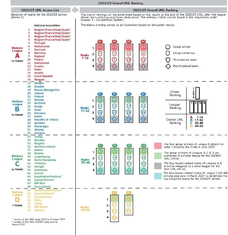 Как и в предыдущем цикле, в дивизионах А, В и С будет выступать по 16 сборных, а в дивизионе D – семь команд. Корзины сформированы по рейтингу сборных по итогам Лиги наций 2020/21. Матчи первого тура Лиги наций 2022/23 запланированы на 2-4 июня 2022-го. Последний тур пройдет в начале сентября следующего года.