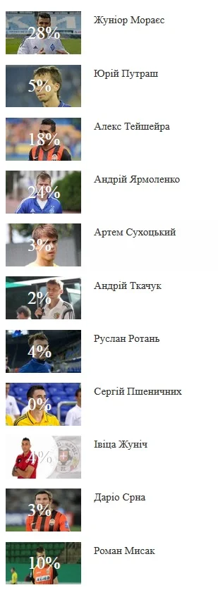 На второй позиции финишировал еще один представитель "Динамо" - Андрей Ярмоленко, который заручился поддержкой 24 процентов читателей.