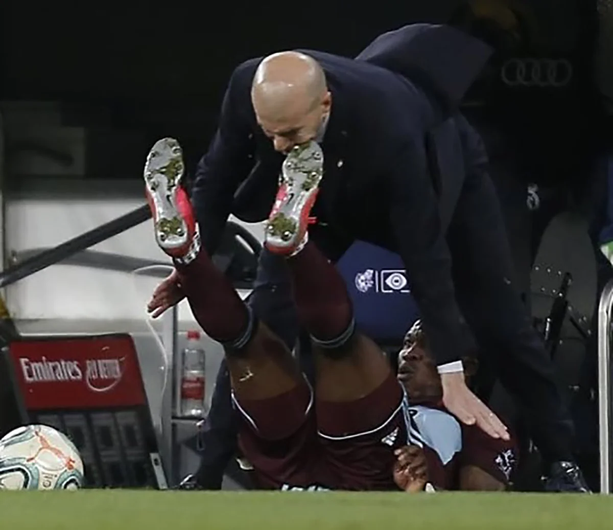 Игрок Сельты Айду пошел в подкат у боковой линии, но немного не рассчитал, что может кого-то задеть за пределами поля. Досталось наставнику мадридцев Зинедину Зидану, перед которым защитник сразу же извинился.