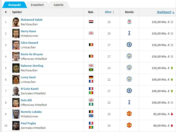 Также в топ-10 попали: Рахим Стерлинг (Манчестер Сити, 120 млн), Лерой Сане (Манчестер Сити, 100), Деле Алли (Тоттенхэм, 100), Н'Голо Канте (Челси, 100), Ромелу Лукаку (Манчестер Юнайтед, 85), Поль Погба (Манчестер Юнайтед, 80).