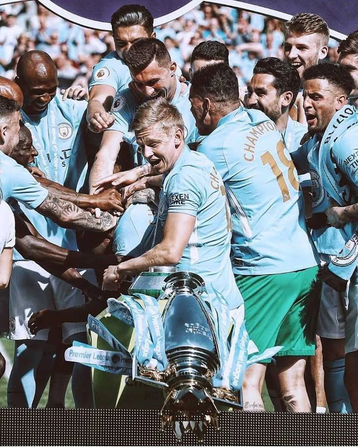 Когда игроки Манчестер Сити уже праздновали, танцуя вокруг трофея, украинский хавбек Александр Зинченко нечаянно перевернул кубок.