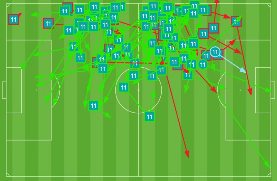 Подробно перфоманс Саши мы разбирали в отчете. Расставим только главные акценты. Украинец принимал активное участие в построении атак (топ-5 в Сити по xGBildup) и традиционно стал лидером команды по количеству передач. Точность просела (85%), но это объясняется желанием обострять игру.