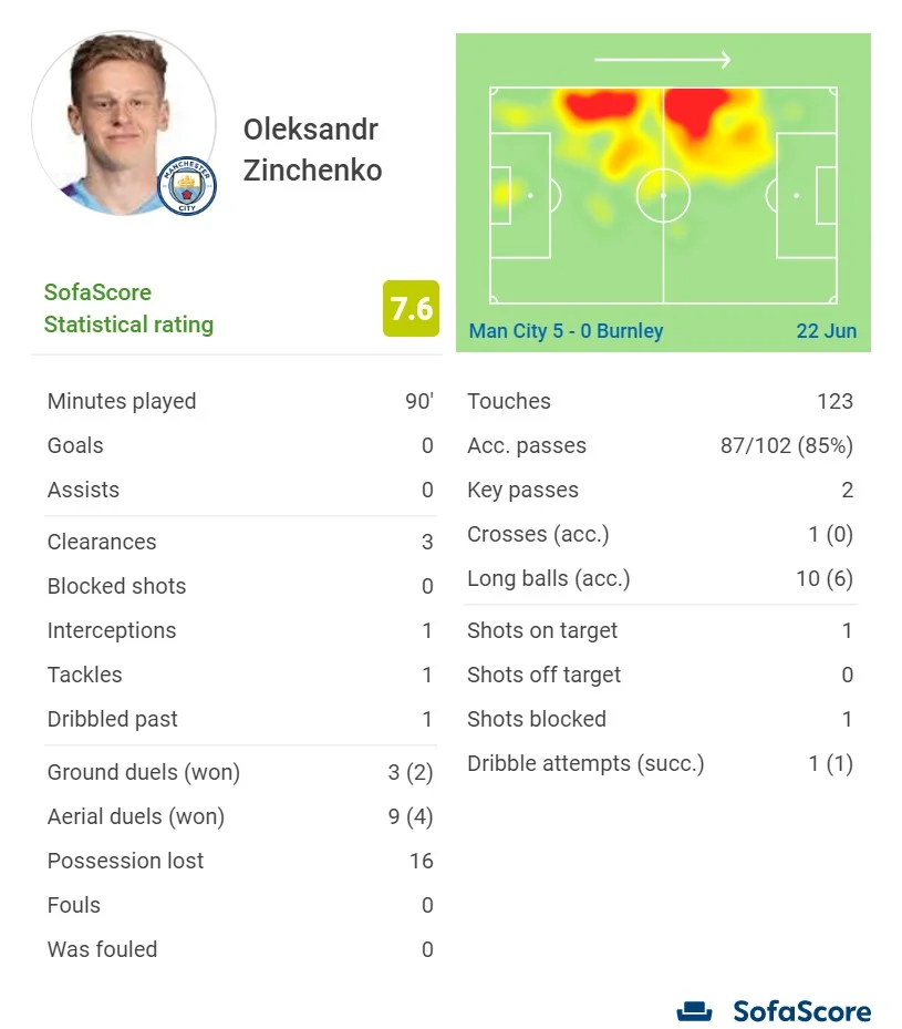 Гвардиола сразу после карантина начал использовать ротацию. По сравнению с матчем против Арсенала тренер тотально изменил стартовый состав – на игру с Бернли вышли 8 новых футболистов. Среди них оказался Александр Зинченко, заменивший слева в обороне Менди. Украинец играл на привычной позиции ложного фулбека, постоянно смещаясь в центр.
