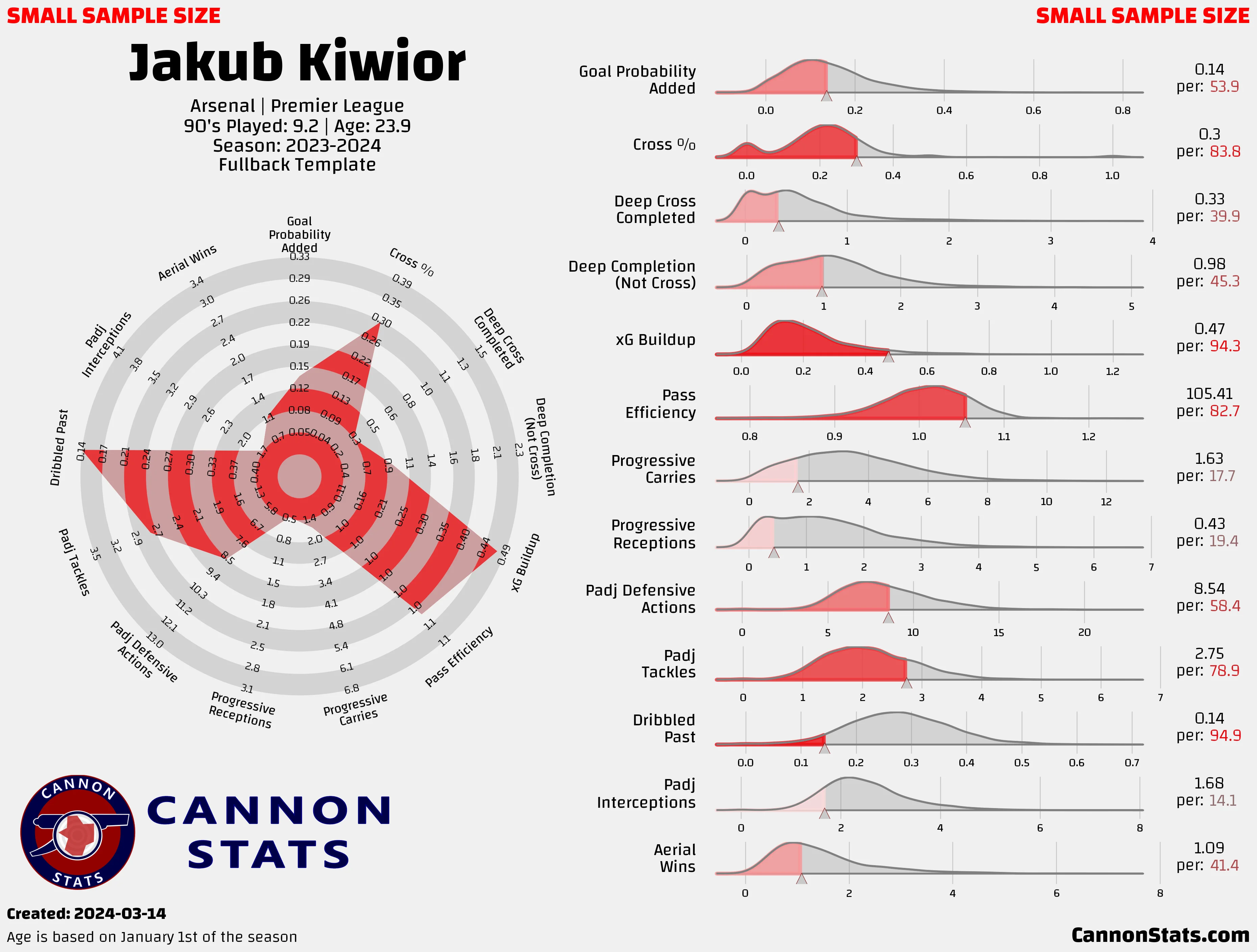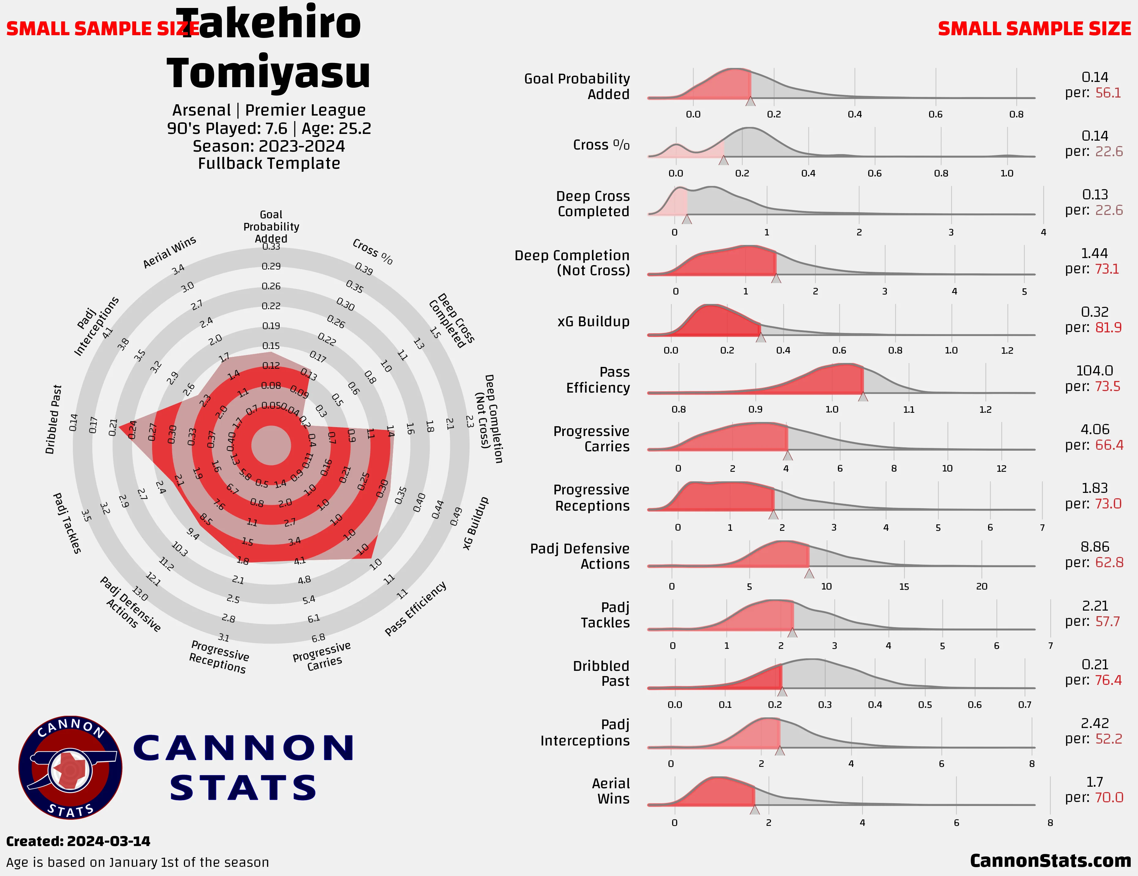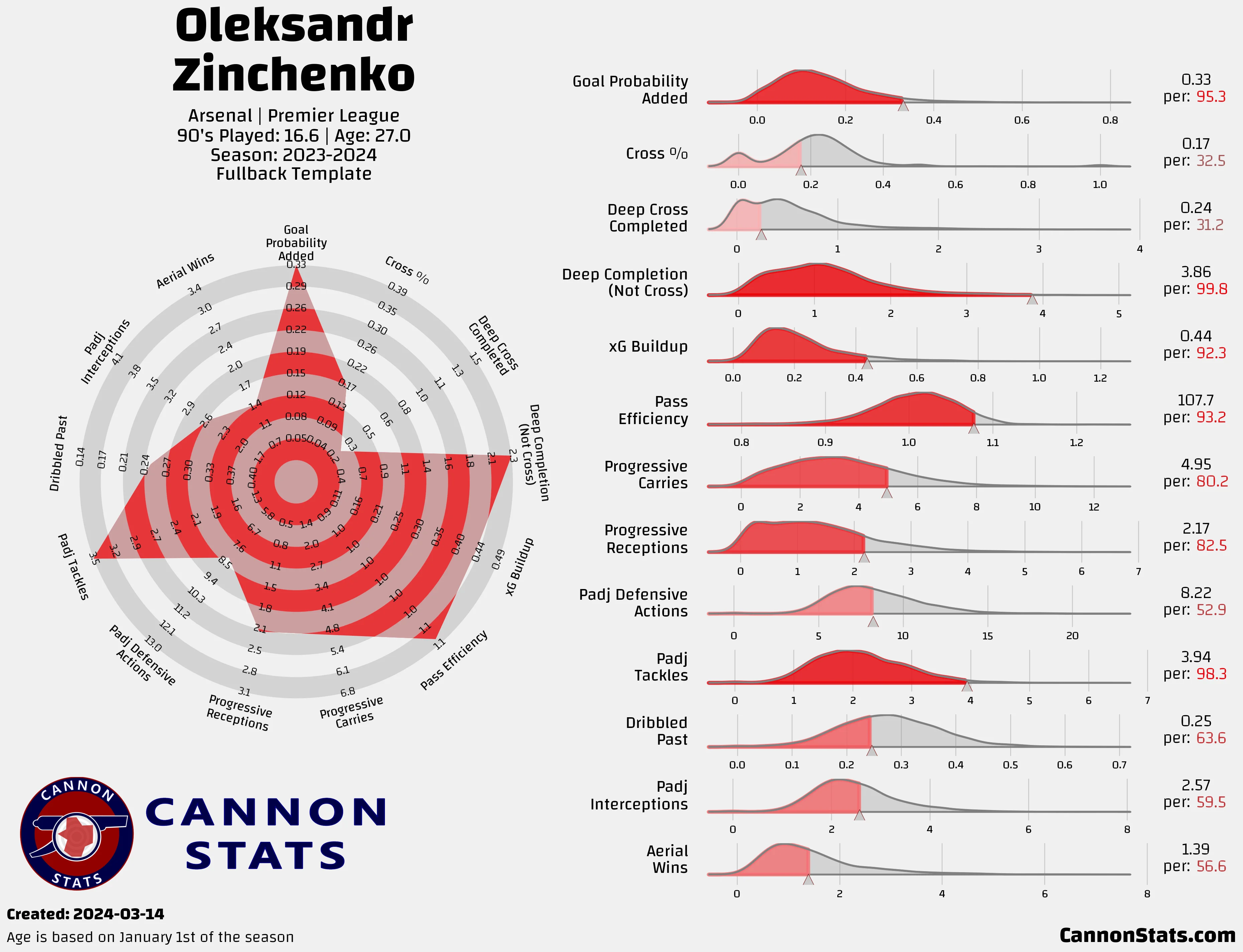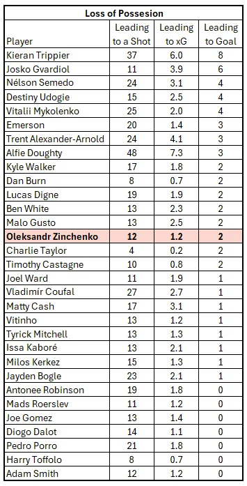 Звичайно, він не ідеальний в роботі з м'ячем, але все одно надійніший за більшість крайніх захисників АПЛ. Ось його показники на фоні інших фулбеків, які зіграли щонайменше 14 повних матчів у чемпіонаті. Після його втрат по воротах Арсенала завдали 12 ударів (на 1,2xG) і забили два голи.