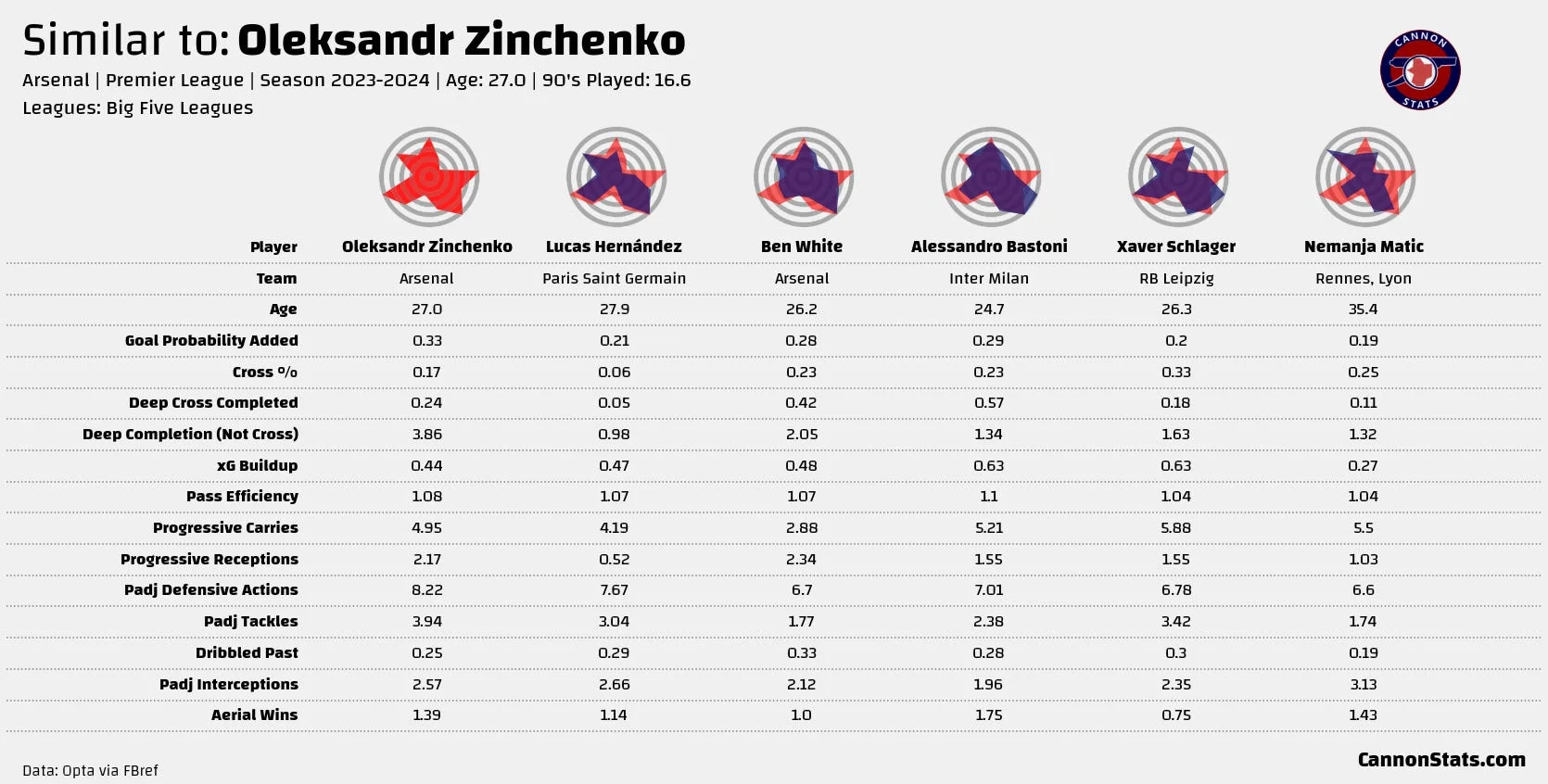 Олександр – особливий гравець, він має особливі функції в Арсеналі, які дуже важко замінити. Просто заради цікавості прикріпляю перелік футболістів, які найбільш схожі на Зінченка за функціоналом.