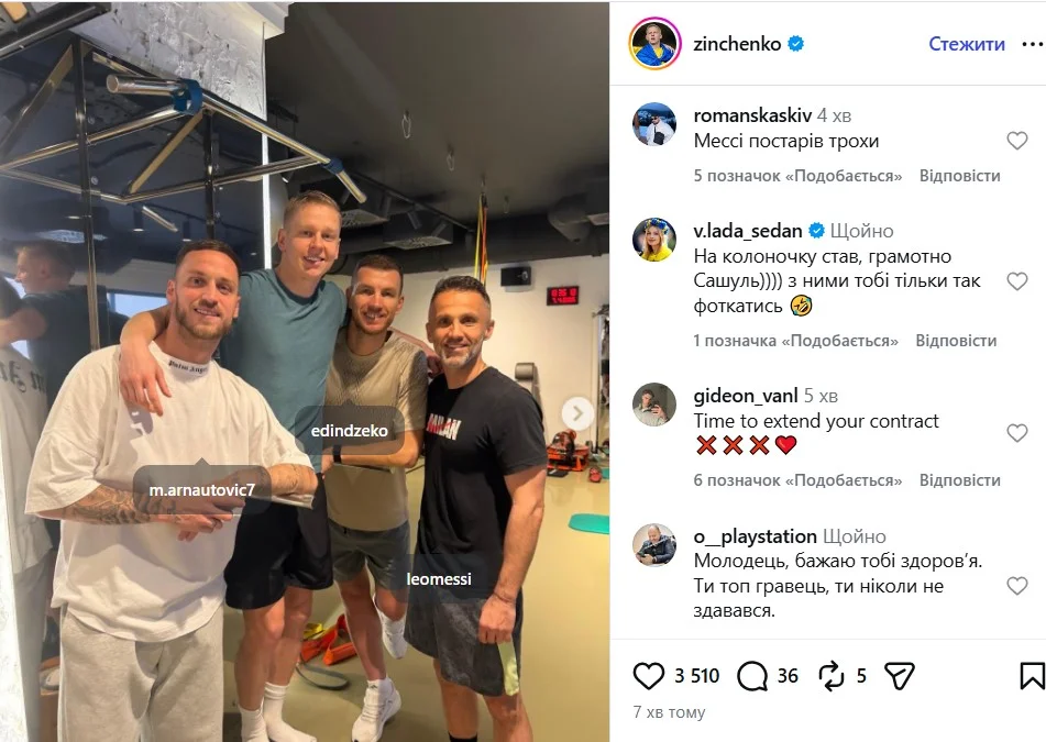 На одном из фото Зинченко стоит рядом с двумя известными футболистами – экс-игроком Ромы, Интера и Манчестер Сити Эдином Джеко и Марко Арнаутовичем, который ранее выступал за Вест Хэм, Интер и другие клубы. Фотографию с игроками прокомментировала супруга Александра Влада Зинченко.