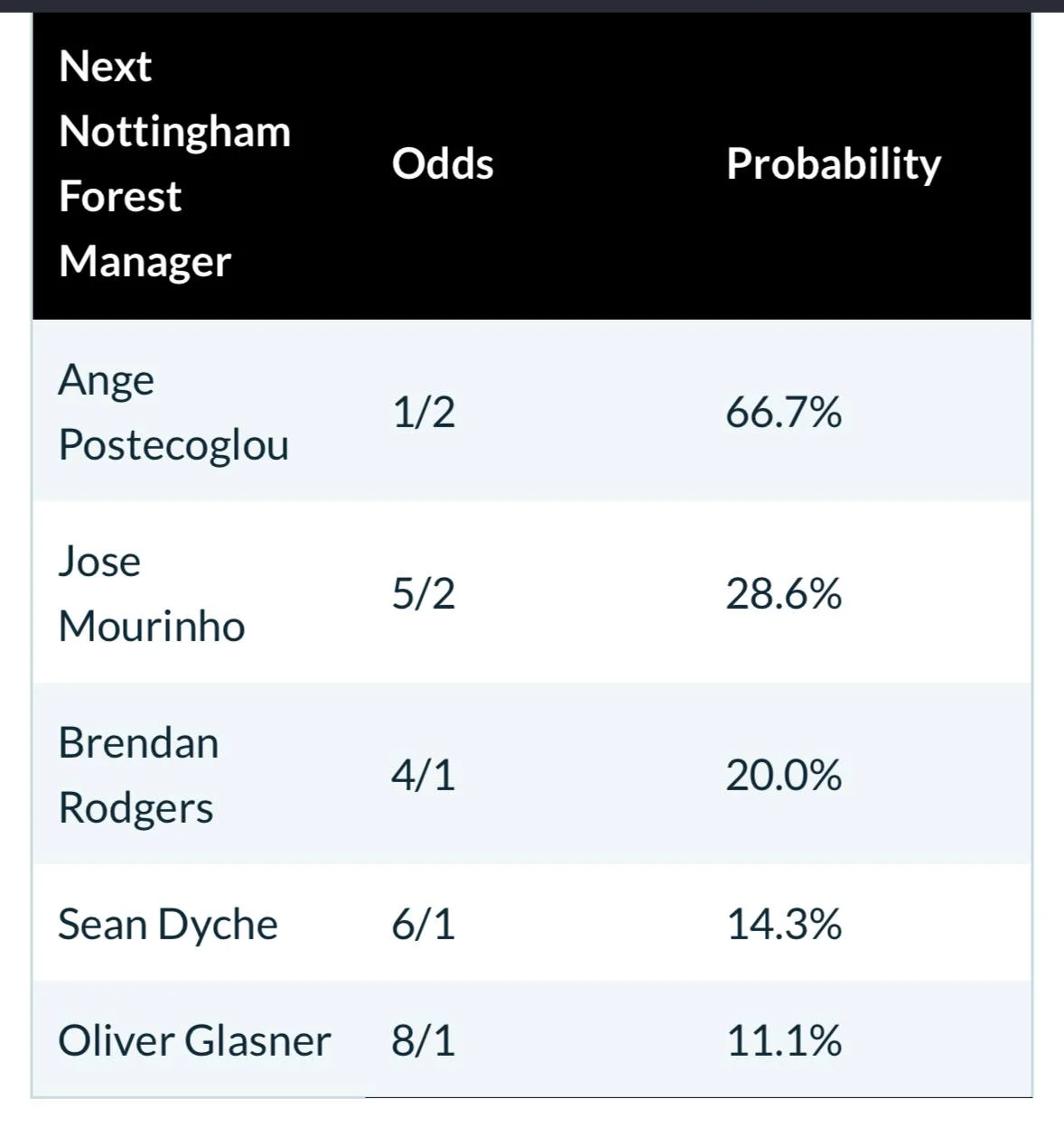 В шорт-листе Ноттингем Форест есть Ангелос Постекоглу, Жозе Моуринью, Брендан Роджерс, Шон Дайч и Оливер Гласнер. Считается, что австралиец греческого происхождения, возглавлявший в прошлом году Тоттенхэм, стал главным кандидатом на пост тренера (66,7%). Вероятность того, что Моуринью возглавит Ноттингем составляет 28,6%, а Брендан Роджерс – 20%.