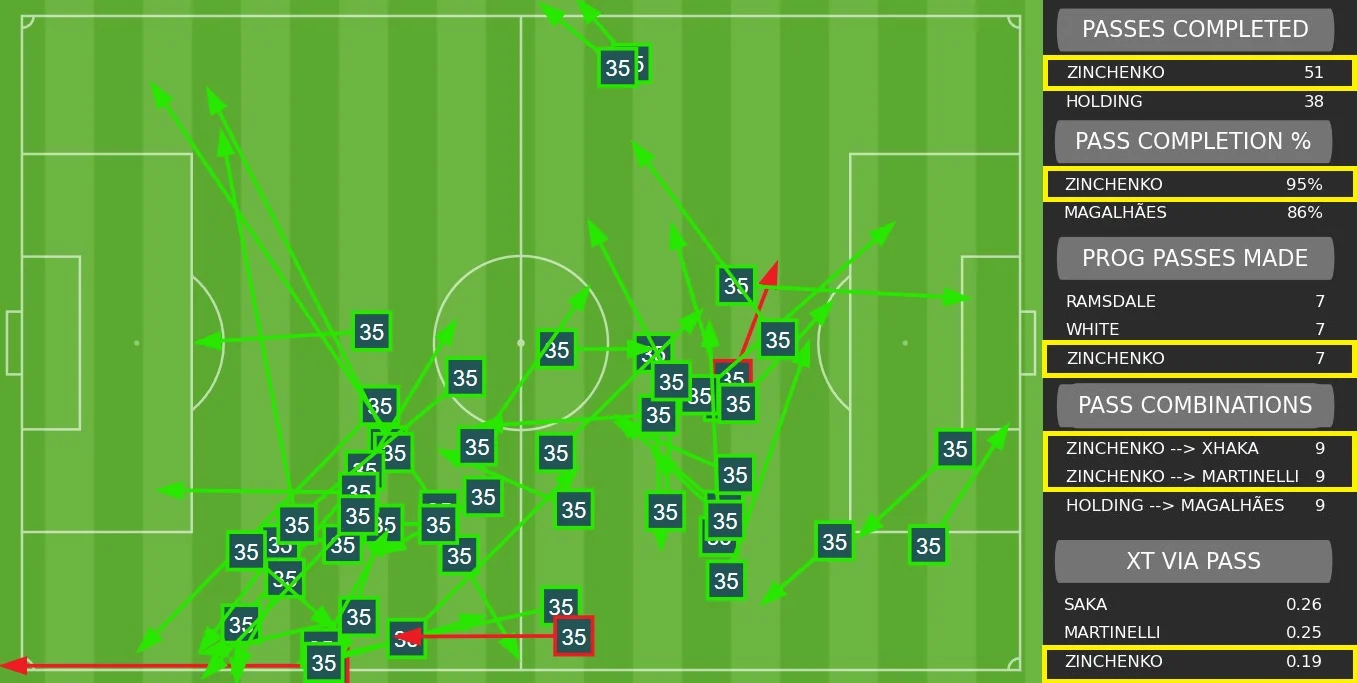 Олександр брав активну участь у побудові атак, розбивав поганий пресинг Ліверпуля. Найчастіше зустрічався з м'ячем і відпрацював з найвищою точністю передач (95%). Це може свідчити про надмірну обережність, але українець постійно пасував вперед (обігруючись з Джакою і Мартінеллі). Став найкращим у команді за передачами з просуванням і увійшов у топ-3 за xThreat (дії, які наближають команду до гола).