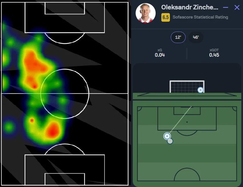 Саме з дій Зінченка розпочалися обидві гольові атаки Арсенала. Щоправда, це просто приємний нюанс, формальність – ключові передачі там віддали інші люди. Значно цікавішим був епізод на 12 хвилині, коли Сашко розвернувся в центрі поля та відрізав 4 суперників, які були в першій хвилі пресингу Ліверпуля. Він розігнав атаку і сам її завершив непоганим ударом в дальній кут (0.45xGOT – Аліссону було непросто).