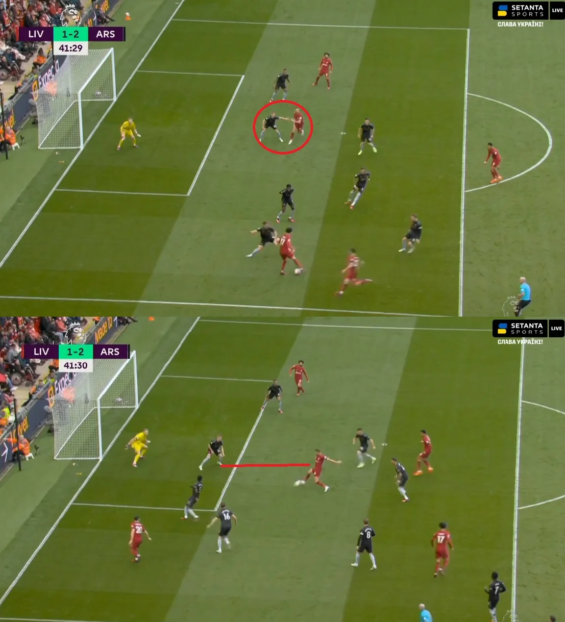 Артета довірився Олександру, але придумав хитрий трюк. В позиційній обороні персонально з Салахом грав центральний захисник Габріел. Бразилець висувався на фланг, а Зінченко сідав в центр захисту. Цікавий задум, який мав полегшити життя українцю. Частково він спрацював – Габріел добре виконав свою частину роботи, обмінюючись позиціями з нашим земляком і страхуючи його.