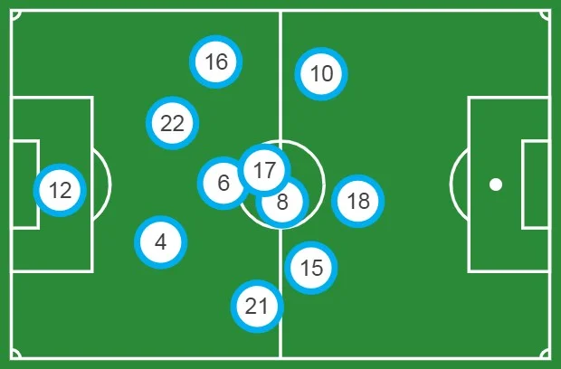 Если на Этихаде украинец является вспомогательным элементом на левом фланге обороны, то здесь – центральной фигурой команды в полузащите (даже по средним позициям на поле Зинченко (17) находится в самом центре, равноудалённым от всех партнеров).