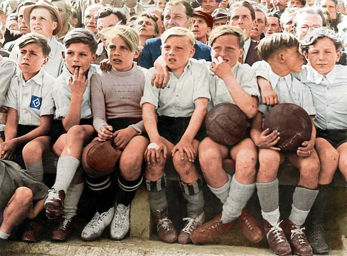 29. Діти війни. Німецькі хлопчаки стежать за матчем Гамбурга, 1947 рік. У центрі, поклавши руки на коліна, сидить Уве Зеелер. Невдовзі він виросте у видатного бомбардира – забиватиме за збірну ФРН, а всю клубну кар'єру проведе у рідних синьо-біло-чорних кольорах.
