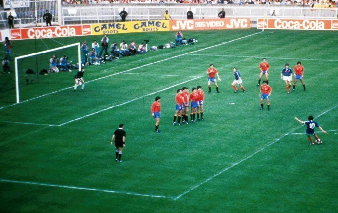 26. ЧС-1986, 1/8 фіналу. Дієго Марадона заряджає зі штрафного по воротах Уругваю – команду Енцо Франческолі, якого бачимо у центрі стінки, врятує лише каркас воріт. Та все ж аргентинці досягнуть бажаного – 1:0.