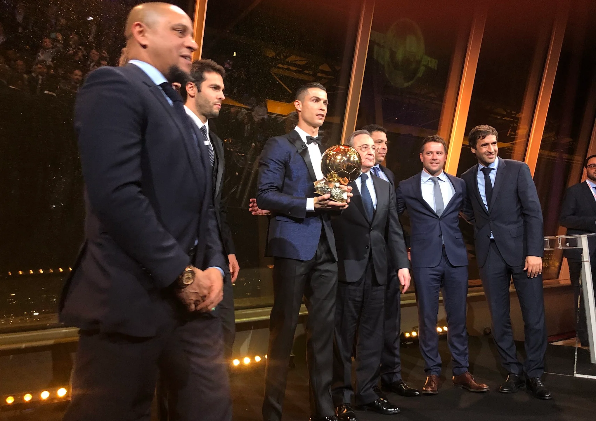 Торжественная церемония состоялась на Эйфелевой башне в Париже. За тем, как Криштиану Роналду получает 5-й "Золотой мяч", наблюдало немало звездных гостей, в том числе Рауль, Каннаваро, Роберто Карлос и Роналдо.