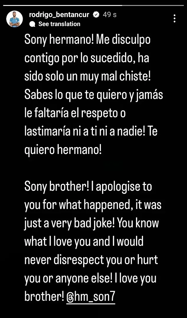 "Сонни, брат! Я приношу тебе свои извинения за то, что произошло, это была просто очень плохая шутка! Ты знаешь, что люблю тебя, и я бы никогда не проявил неуважения к тебе или причинил боль тебе или кому-либо еще! Люблю тебя, брат!", – написал уругваец в своих соцсетях.