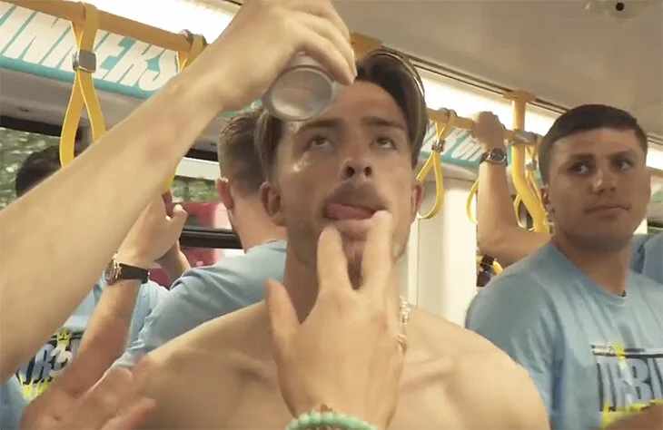 Полузащитник начал праздновать еще в автобусе с пивом, когда вся команда собралась для того, чтобы поделиться радостью с фанатами. На этом англичанин не остановился. Он разгуливал по улицам Манчестера с шампанским, которым его и облили. На импровизированной сцене Грилиш продолжил употреблять алкоголь. Партнер по команде просто заливал в игрока водку. Некоторые игроки отправились из Манчестера на Ибицу в компании полузащитника, где англичанин, похоже, не перестал пьянствовать. Как свидетельствуют фото из соцсетей, Кайлу Уокеру пришлось вести пьяного Грилиша под руки в готель.