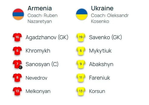 Игру на воротах украинской команды начнет Юрий Савенко. В четверку полевых попали Артем Фаренюк, Даниил Абакшин, Николай Микитюк и Игорь Корсун.