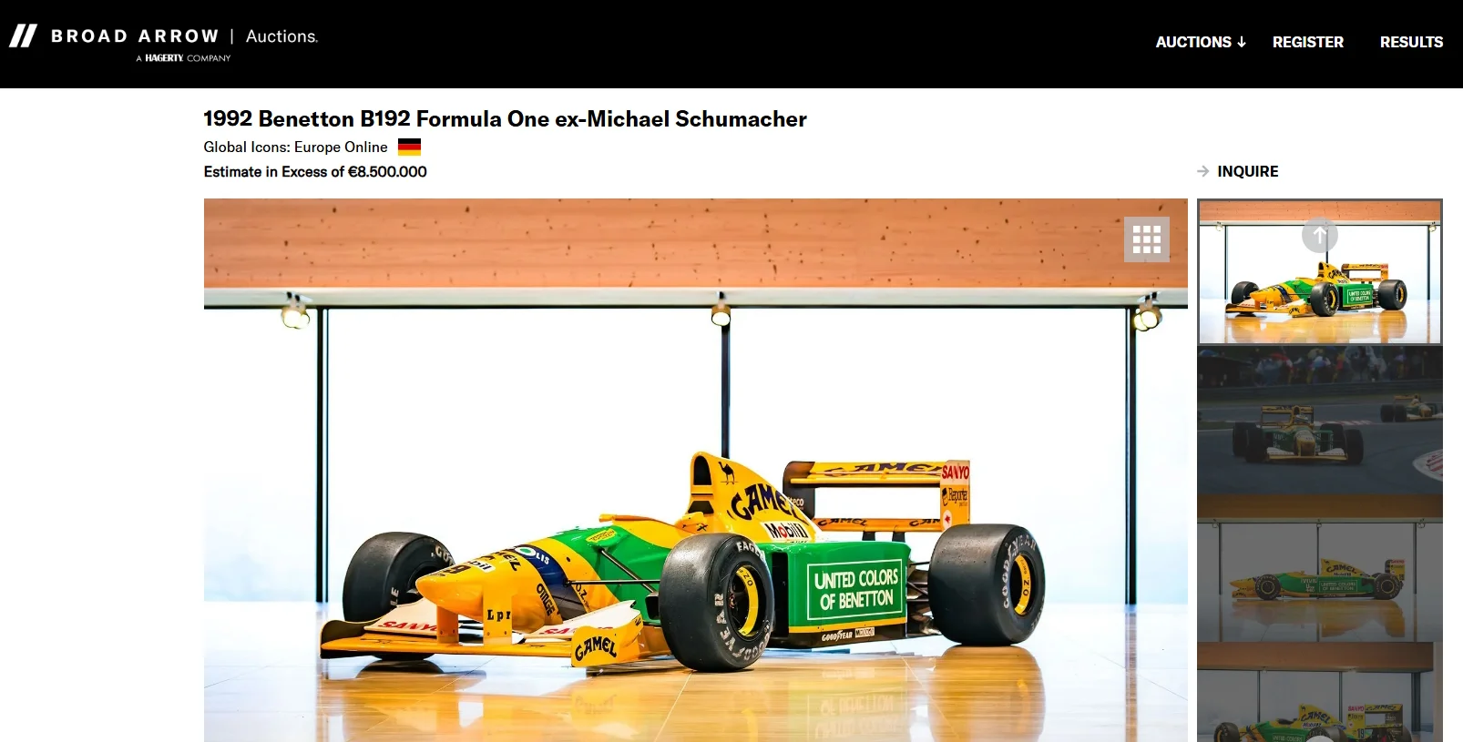 Болид команды Benetton-Ford с номером 05, за рулем которого Михаэль Шумахер одержал свою первую победу в Формуле-1, был выставлен на аукцион. Об этом сообщил организатор торгов Broad Arrow.