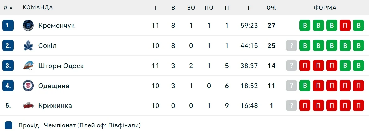 Кременчуг имеет 27 очков и поднялся на первое место в таблице чемпионата Украины. Вторым идет Сокол, у которого 25 очков. Шторм на третьей позиции – у него 14 очков.