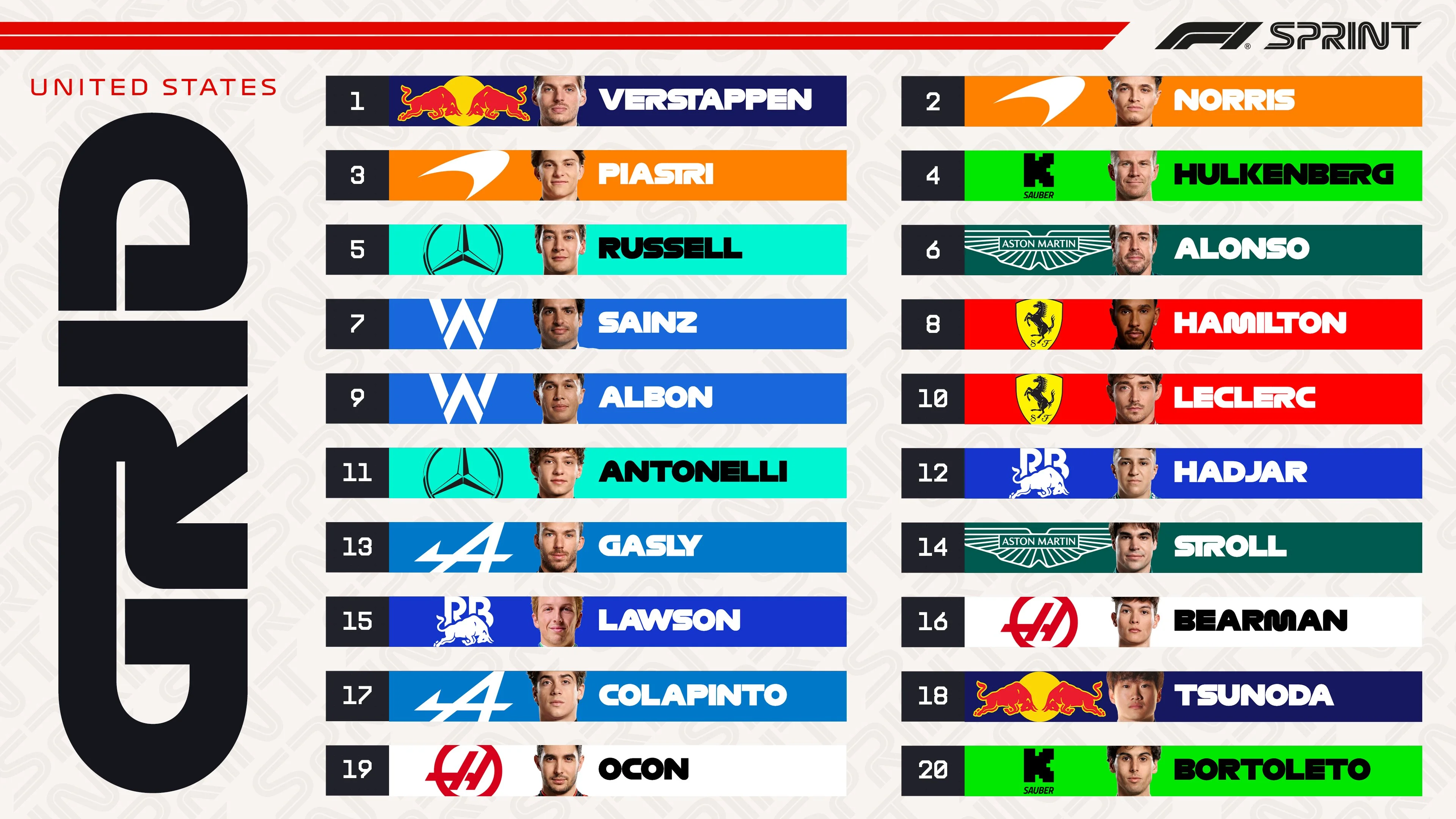 Борьба за поул фактически шла между двумя пилотами, потому что Пиастри быстро смирился с третьим местом. Ландо Норрис показал хорошее время, однако Макс Ферстаппен в очередной раз вытащил козырь в решающий момент и забрал поул с преимуществом всего в 71 тысячную секунды. Именно лидер Ред Булл будет стартовать первым в субботнем спринте, который должен начаться в 20:00 по киевскому времени.