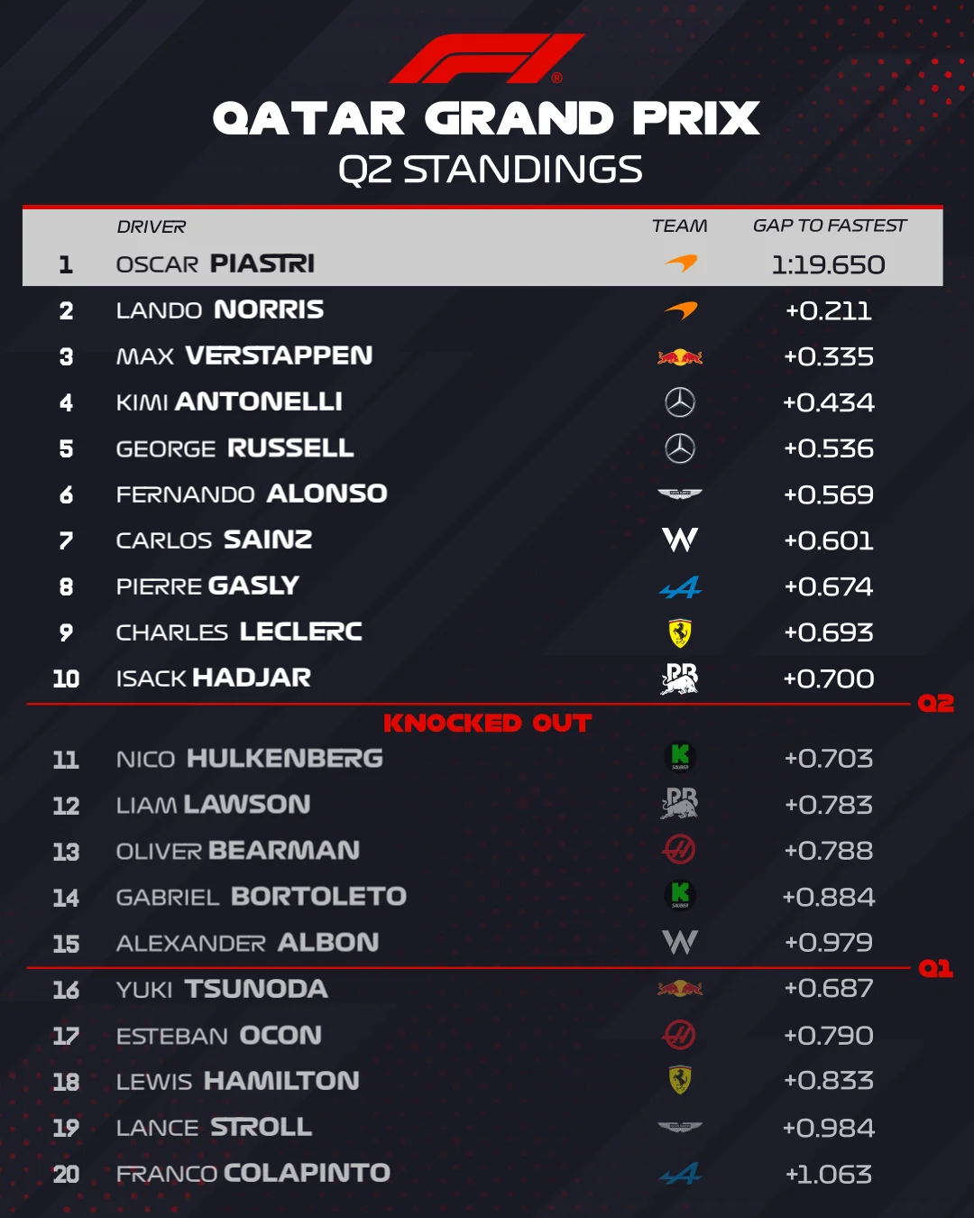 Поул в итоге получил Оскар Пиастри, который опередил Ландо Норриса. Только с третьей позиции будет стартовать в гонке Макс Ферстаппен.