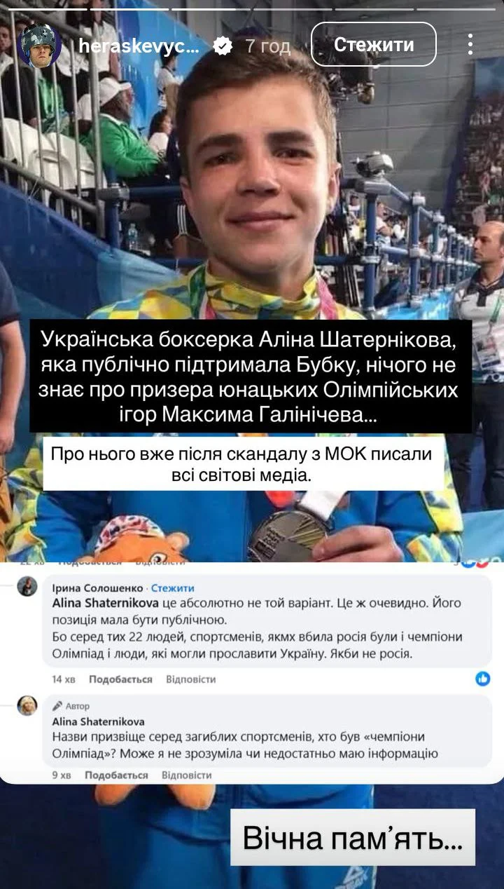 "Украинская боксерка Алина Шатерникова, которая публично поддержала Бубку, ничего не знает о призере юношеских Олимпийских игр Максиме Галиничеве. О нем уже после скандала с МОК писали все мировые медиа. Вечная память", – написал Гераскевич в своем Instagram.