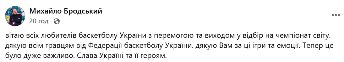 Спасибо всем игрокам от Федерации баскетбола Украины. Спасибо вам за эти игры и эмоции. Теперь это было очень важно. Слава Украине и ее героям", – написал Бродский в Facebook.