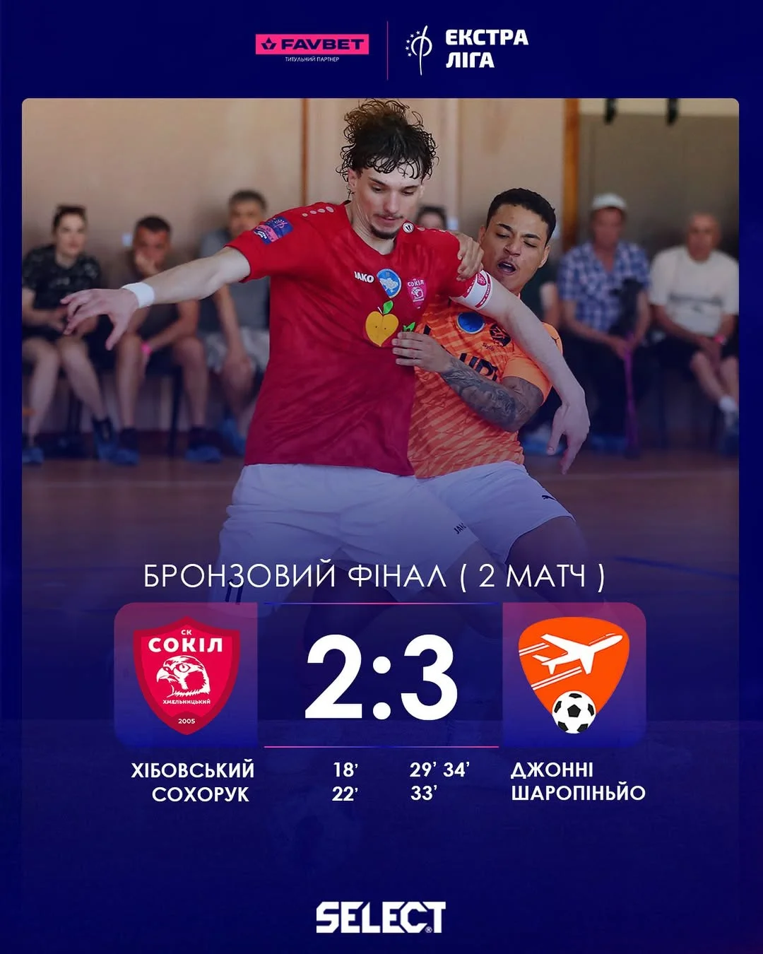 "Авиаторы" в начале второго тайма пропустили второй гол от Сокола и были близки к поражению в поединке, но смогли в игру вернуться. Дубль Джонни и гол Шаропиньо принесли SkyUp победу со счетом 3:2. Интересно, что SkyUp и в первом матче серии одержал волевую победу 8:4.