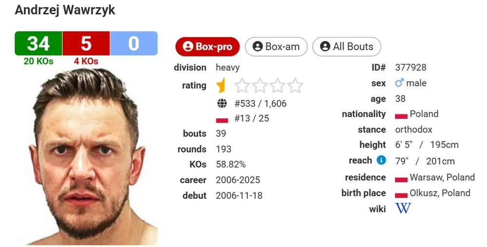 Текущий послужной список Анджея Ваврика составляет 34 победы и 5 поражений.
