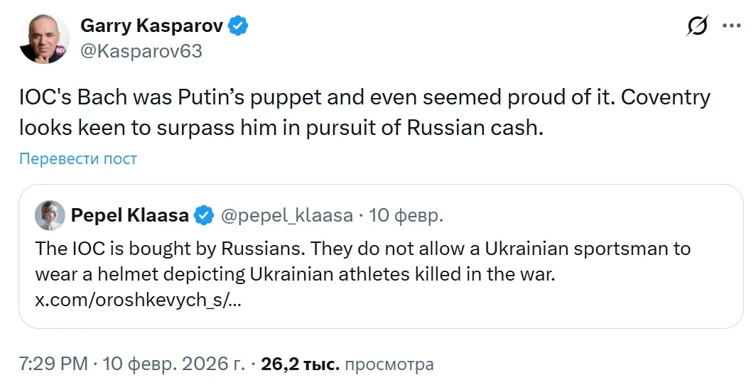 "Бах из МОК был марионеткой Путина и, похоже, даже гордился этим. Ковентри, похоже, стремится превзойти его в погоне за российскими деньгами", – написал Каспаров в сети Х.
