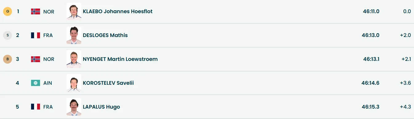 Вторым в гонке стал француз Матис Делож, а третьим – другой норвежец, Мартин Левстрём Нингет, который не пустил в тройку "нейтрального" россиянина Савелия Коростелева.