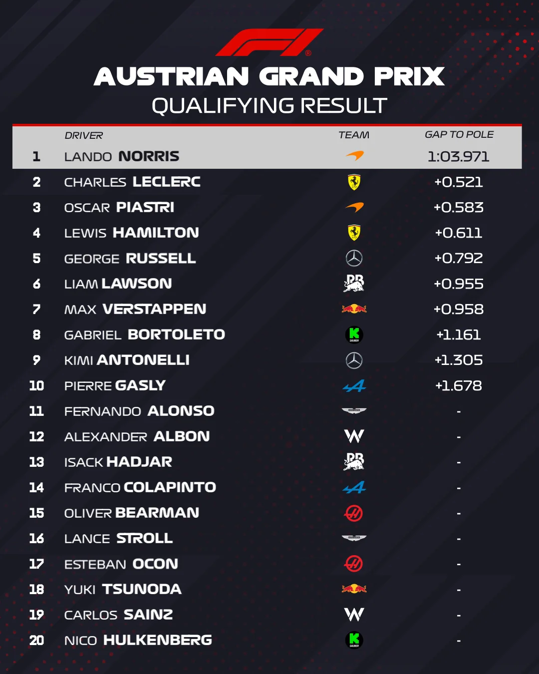 Победителем квалификации Гран-при Австрии стал пилот Макларен Ландо Норрис. Его напарник по команде Остак Пиастри продемонстрировал третье время. Вторую и четвертую строчки соответственно заняли пилоты Феррари – Шарль Леклер и Льюис Хэмилтон.