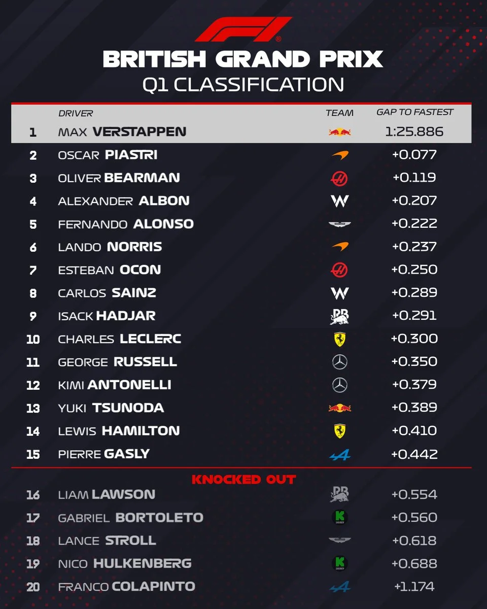 Пилот Ред Булл Макс Ферстаппен стал победителем квалификации Гран-при Великобритании. В первой тройке он оставил позади себя двух гонщиков из Макларена – Оскара Пиастри и Ландо Норриса.