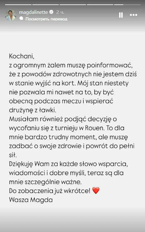 Я тоже приняла сложное решение сняться с турнира в Руане. Это очень тяжелый момент для меня, но я должна позаботиться о своем здоровье и возвращении к нормальной форме. Спасибо вам за каждое слово поддержки, за сообщения и добрые мысли – сейчас для меня это особенно важно. До встречи уже совсем скоро! Ваша Магда", – написала Линетт на своей странице в социальной сети Instagram.