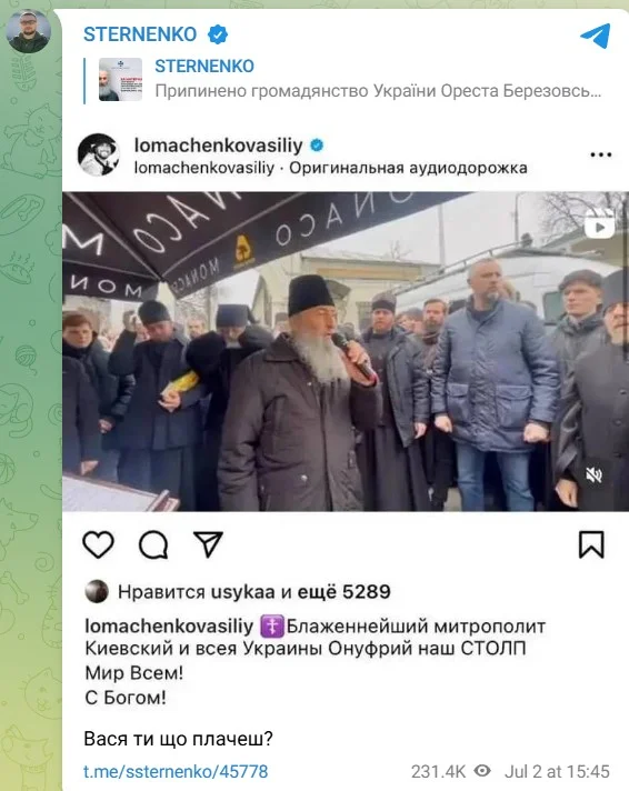Ломаченко отреагировал на лишение гражданства Украины митрополита Онуфрия – Стерненко не обошел вниманием