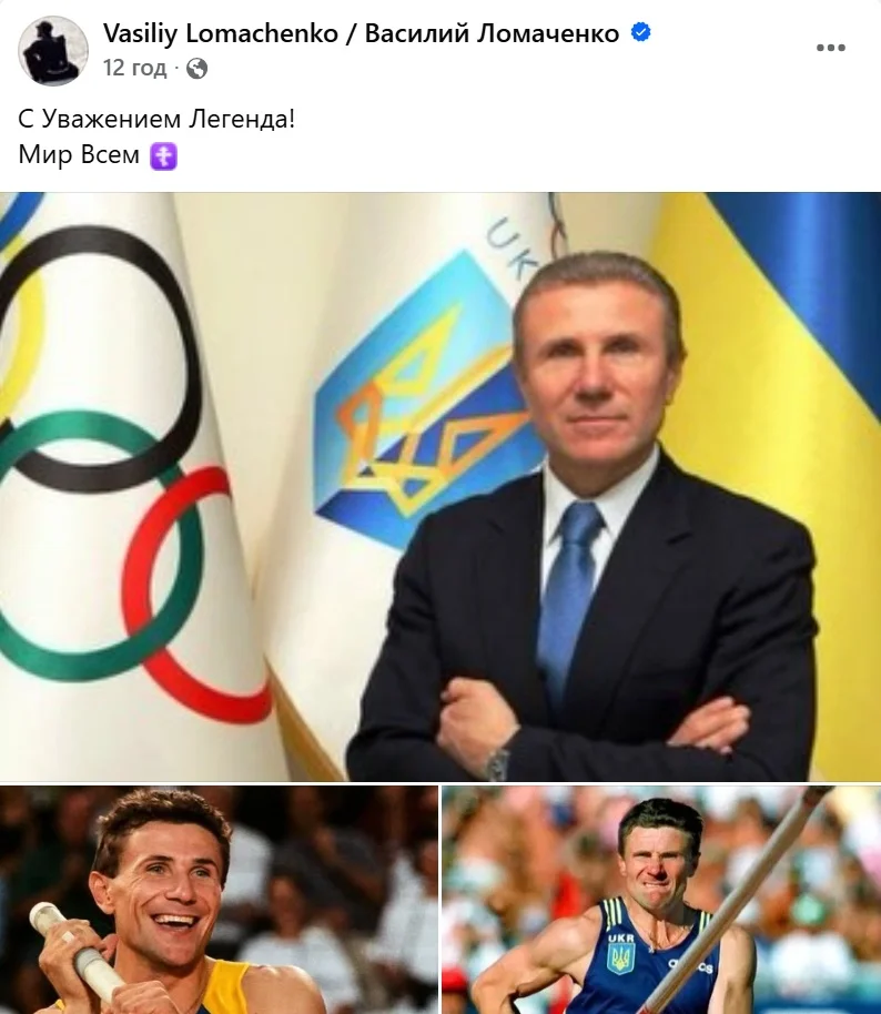 "С уважением Легенда! Мир всем", – написал Ломаченко в посте и добавил несколько фотографий бывшего рекордсмена мира в прыжках с шестом Сергея Бубки.