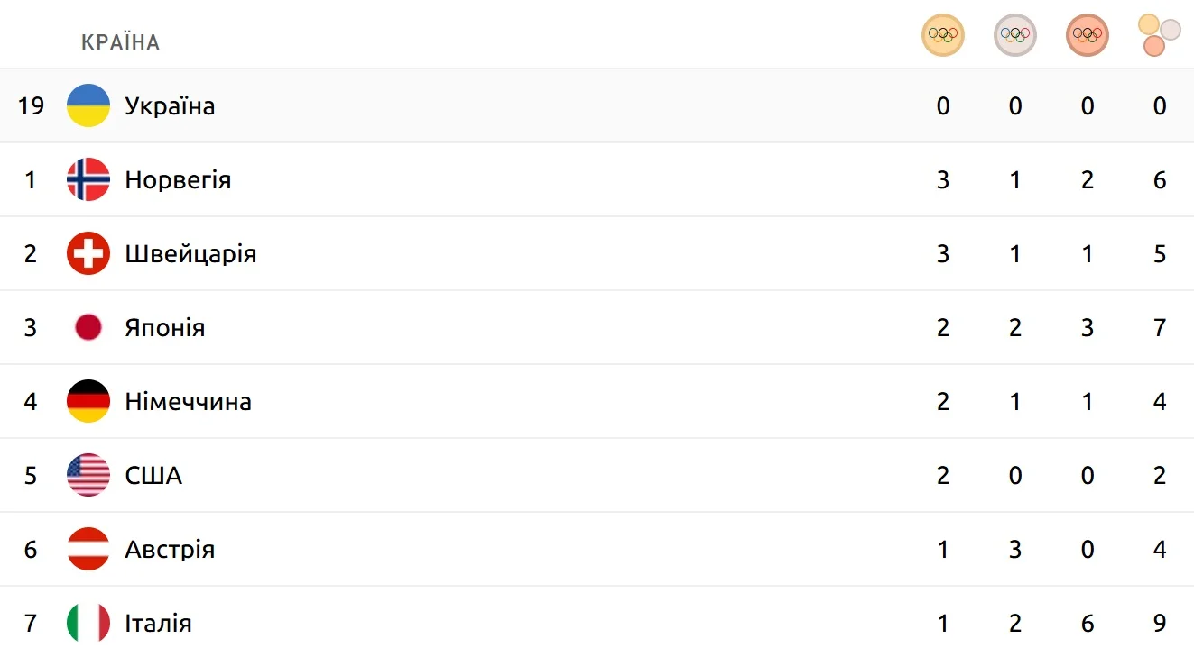 Сборная Украины по итогам шести соревновательных дней Олимпиады 2026 пока не имеет медалей в своем активе.