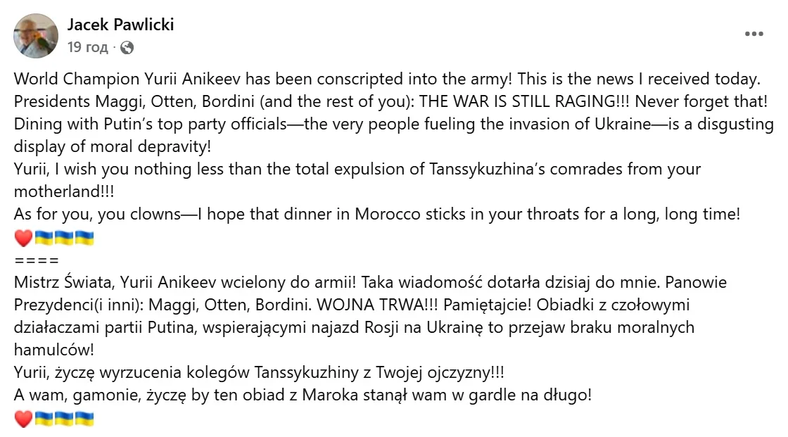 Юрий, я желаю тебе не меньше, чем полного изгнания товарищей Тамары Тансиккужиной (шашечницы из РФ) с твоей Родины! А вы, клоуны, – надеюсь, ужин в Марокко надолго застрянет у вас в горле!", – написал Павлицки в Facebook.