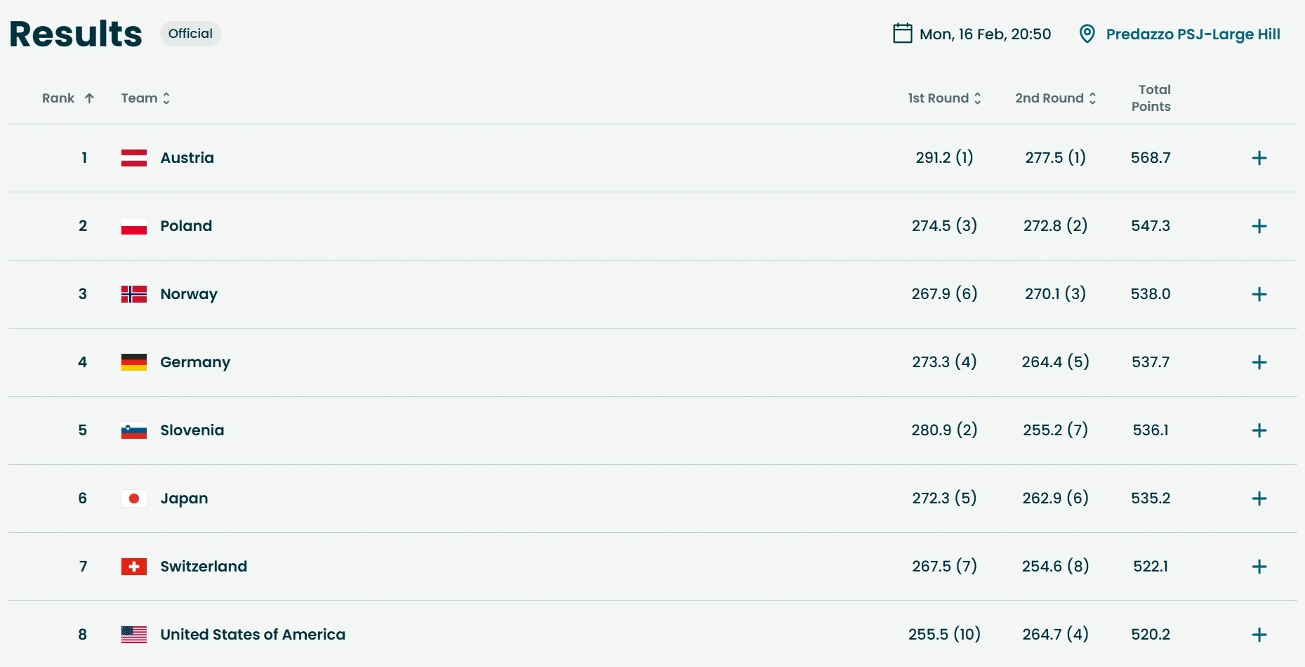 Топ-8 итогового протокола в соревнованиях суперкоманд по прыжкам с трамплина